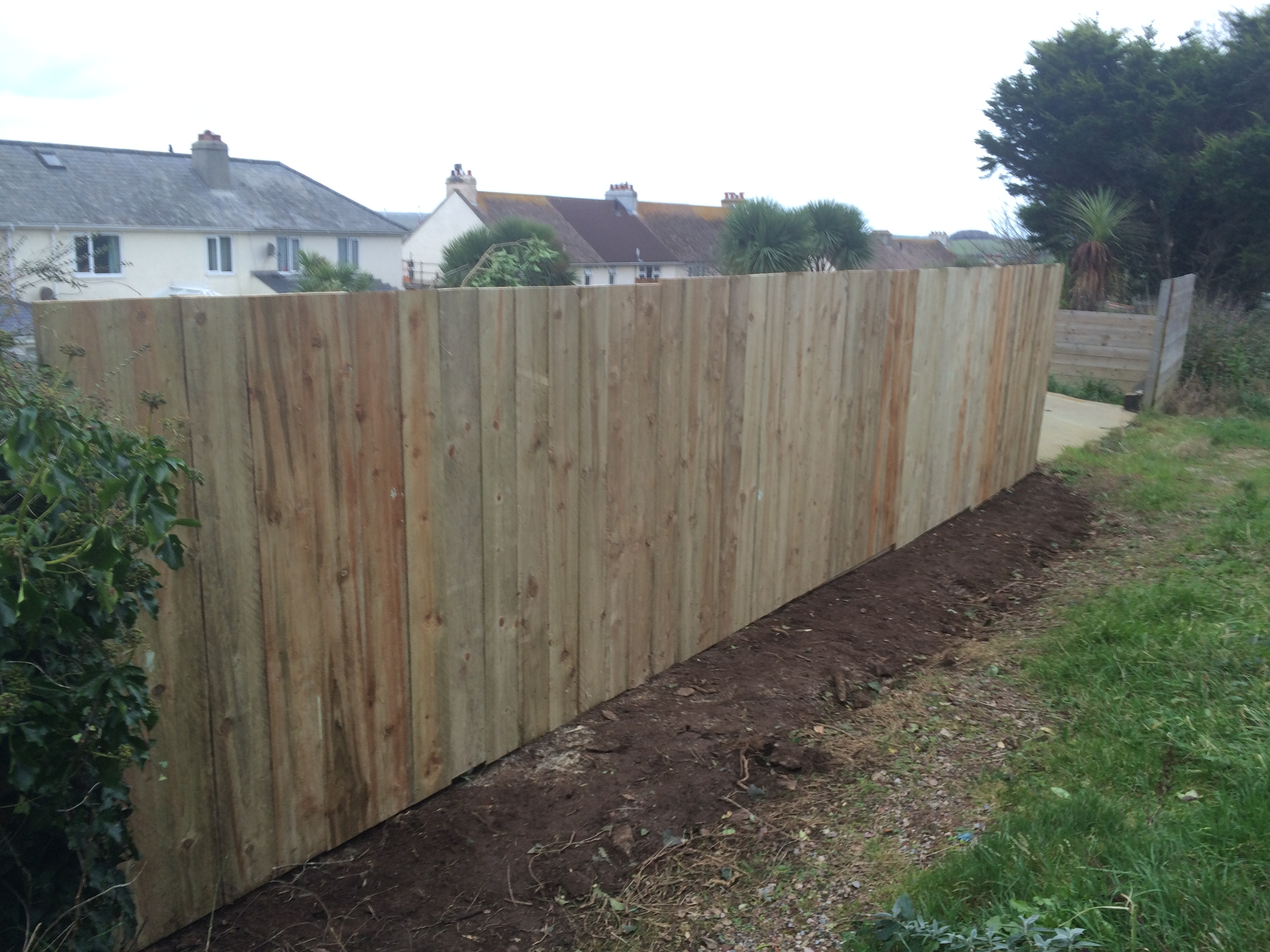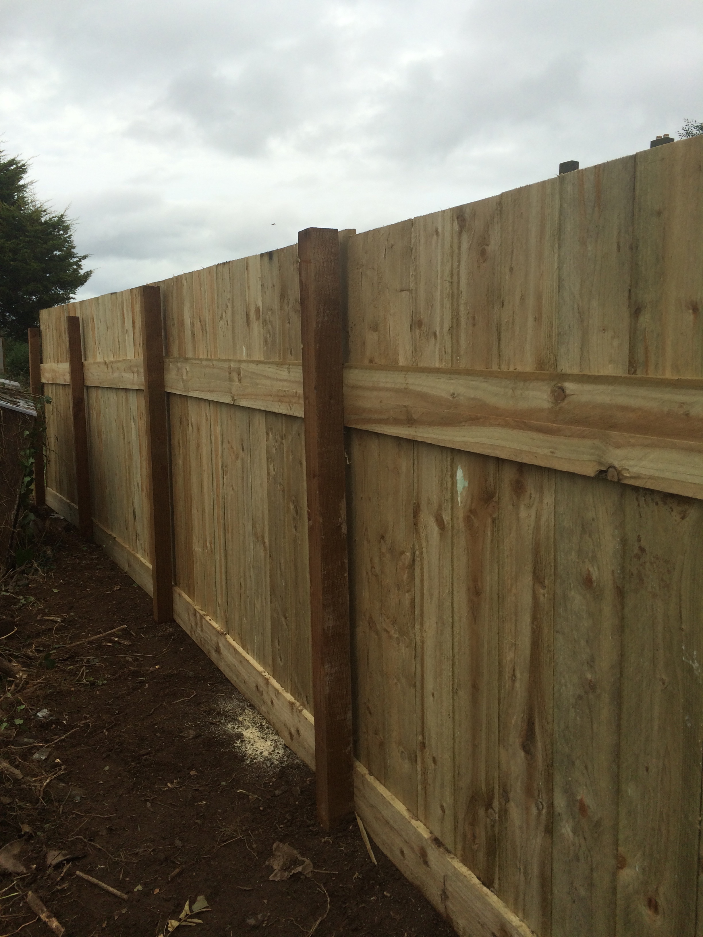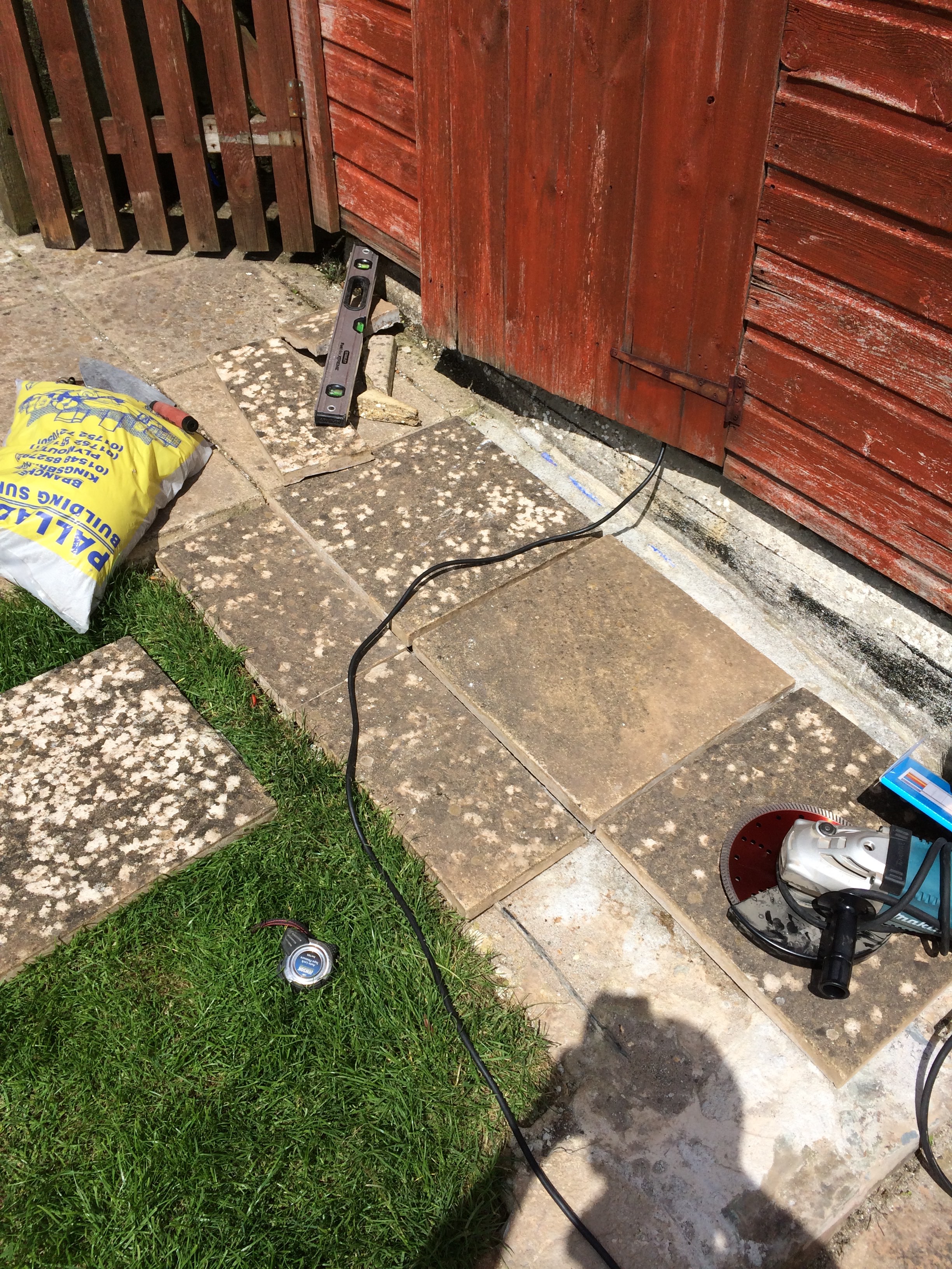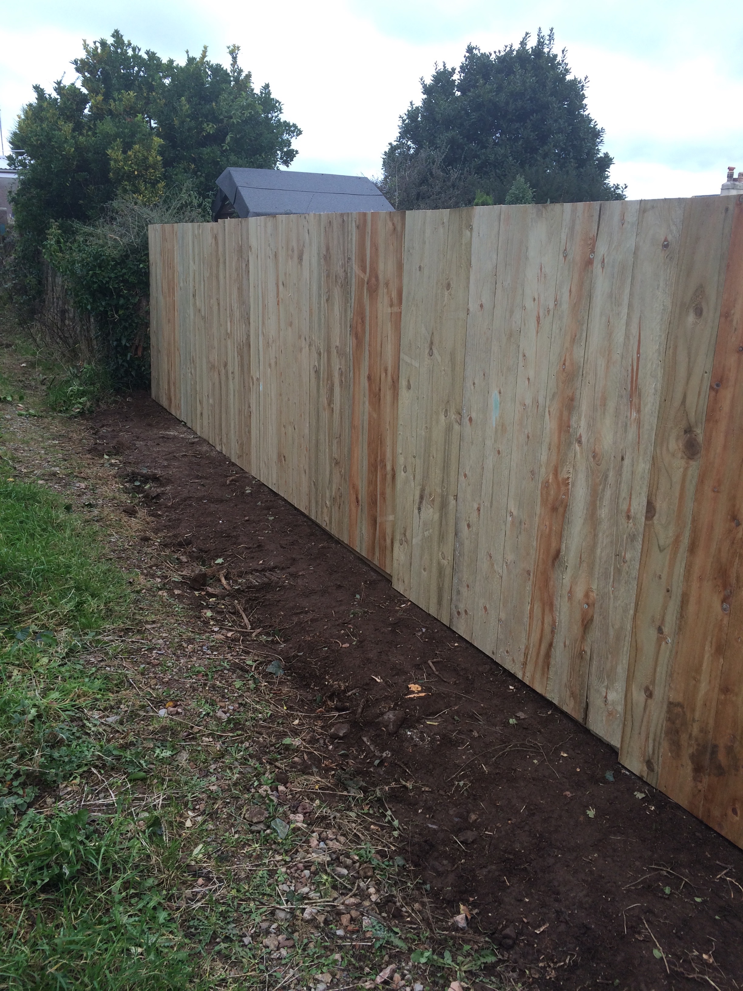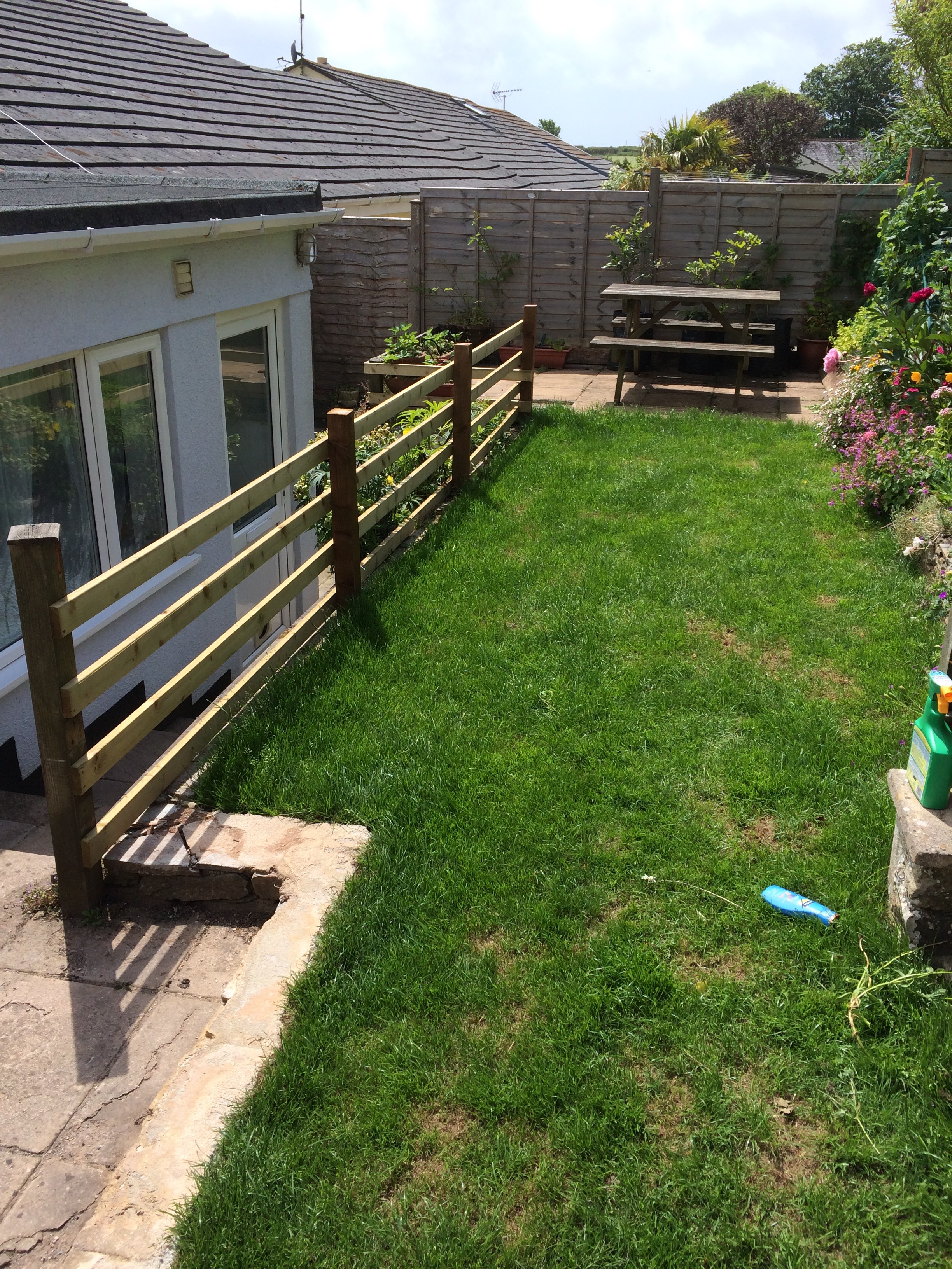 In this job i am converting a patio back into a lawn with a stepping stone slab lay out for a path with shingle, with a higher fence for safety reasons